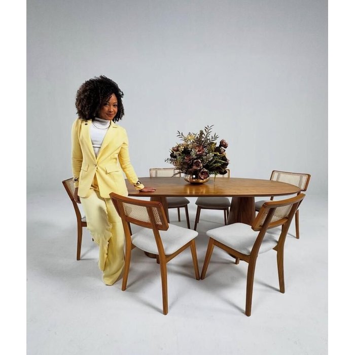 Com design orgânico e moderno, ela conta com tampo em formato exclusivo que valoriza a decoração, trazendo leveza e charme ao espaço. Acompanha 6 cadeiras em madeira maciça, com assento estofado em linho e encosto em rattan, garantindo conforto e um toque natural e aconchegante.