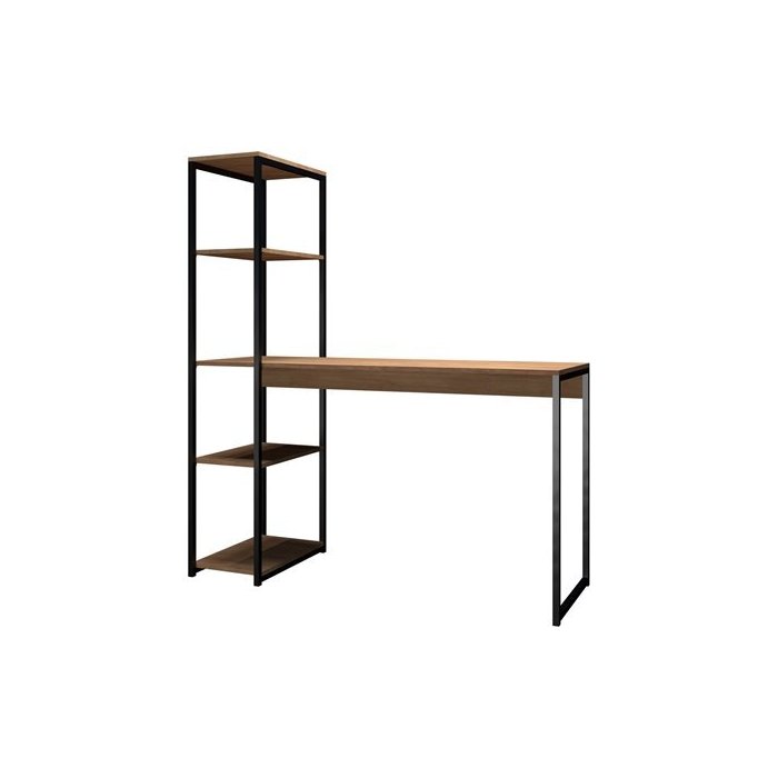 A base da mesa é composta por pés em metal, que garantem estabilidade e resistência, proporcionando um visual industrial arrojado e moderno. A estante integrada na lateral da mesa oferece espaço adicional para armazenar livros, arquivos e outros materiais de escritório, mantendo-os sempre à mão.
