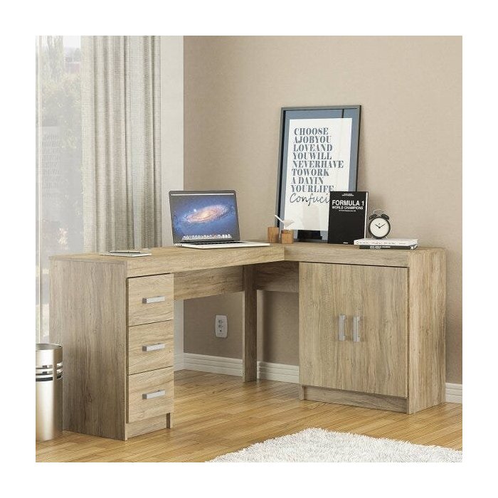 Mesa para Escritório em L 2 Portas 3 Gavetas Espanha Politorno Carvalho Claro