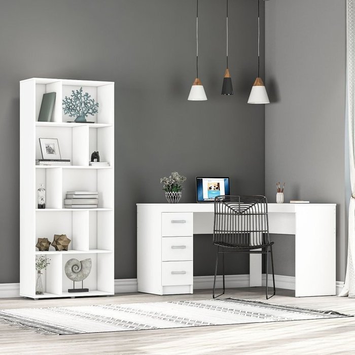 Mesa para Escritório em L 3 Gavetas com Estante Montessoriana com 10 Nichos Branco