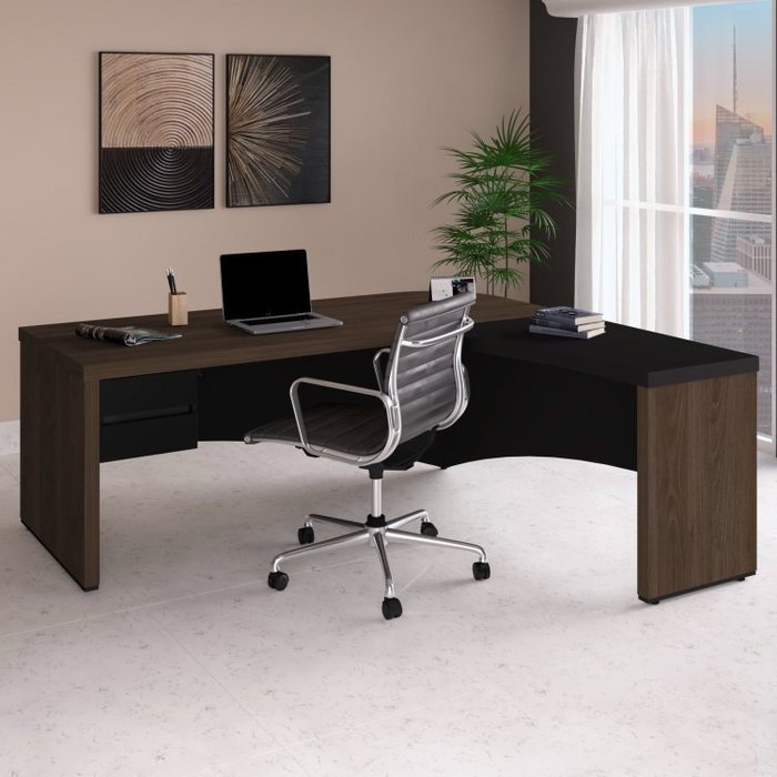 Mesa para Escritório em L Tamburato Diretor com 2 Gavetas com Chave Artany Charuto/Preto