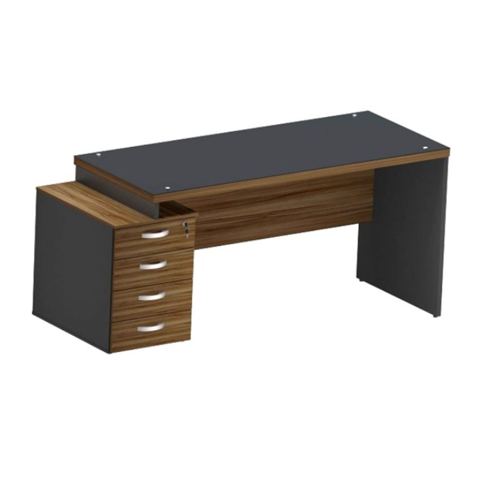 Produzida em MDP 15 mm com engrossamento de mais 25 mm nas bordas do tampo, acabamento do tampo em fita de borda 1mm. Vidro fumê de 4 mm com fixação nos 4 cantos. Possui um gaveteiro pedestal servindo de base para o outro lado da mesa. Gaveteiro pedestal produzido em MDP 15 mm sendo apenas o fundo da gaveta em T-HDF 3mm, acabamento em fita de borda 0,45 mm. Nicho na parte traseira do gaveteiro. O gaveteiro de 4 gavetas. Puxadores em PVC prata 96 mm, fechadura com travamento na primeira gaveta, sapatas niveladoras, corrediças metálicas e telescópicas nas gavetas que possuem pasta suspensa.