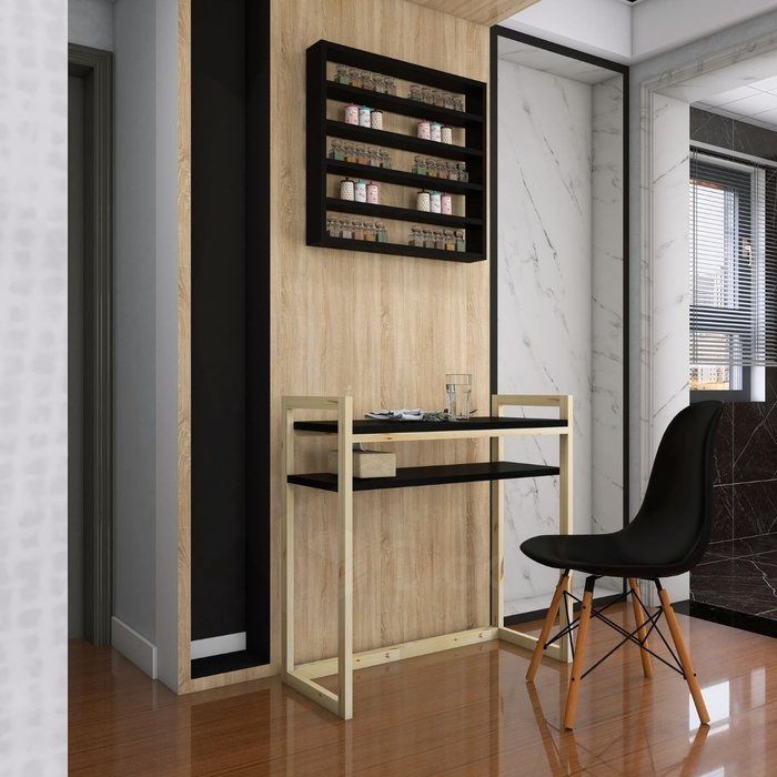 Mesa Minimalista com Pé Pinus + Cadeira Eames + Prateleira de Esmalte com alta resistência, durabilidade e acabamento. Pode ser utilizado para Salão de beleza, consultórios, cabeleireiro, quarto.