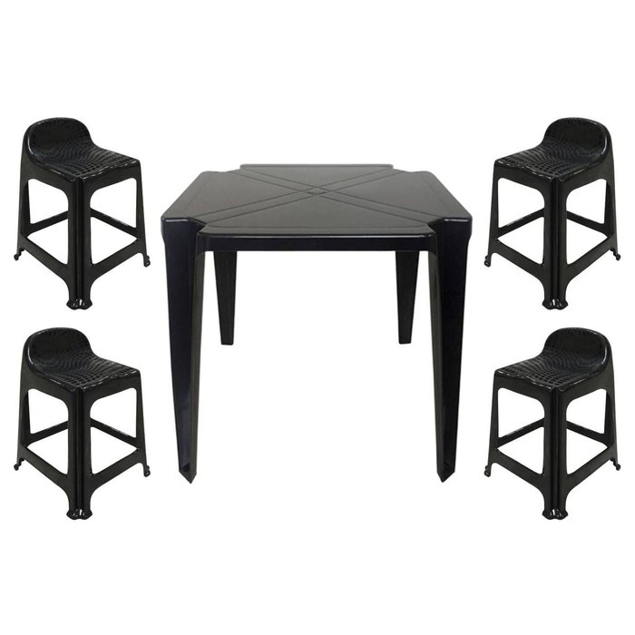 Mesa de Plástico Quadrada 70cm Empilhável Preta Monobloco com 4 Banquetas de Plástico Com Encosto