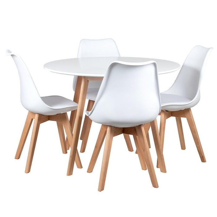 Cadeira Leda: Material do encosto: Polipropileno - Material do assento: Couro PU - Material dos pés: Madeira natural - Altura do encosto: 82 cm - Altura do assento: 44 cm - Largura do assento: 48 cm - Profundidade do assento: 43 cm - Distância entre os pés: 42 cm - Peso suportado: 130 kg. Mesa redonda Leda: Material do tampo: MDF laqueado (laca fosca) - Material da base: Madeira natural - Altura: 70 cm - Diâmetro do tampo: 100 cm - Garantia: 3 meses. Altura: 75 cm | Cor: Multicolorido | Garantia do fabricante: 3 meses | Largura: 100 cm | Peso do produto: 25 kg | Produto: Conjunto de Mesa e Cadeiras | Quantidade de lugares: 4 | Material do tampo (mesa): MDF laqueado (Laca fosca) | Material da base (mesa): Madeira | Altura (mesa): 70 cm | Diâmetro (mesa): 100 cm | Material do assento (cadeiras): Polipropileno e couro PU | Material da base (cadeiras): Madeira natural | Altura do assento (cadeiras): 44 cm | Largura do assento (cadeiras): 48 cm | Profundidade do assento (cadeiras): 43 cm | Fabricante: Mobili | RBN: 17100657011 Cor: Branco
