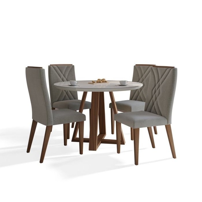 Mesa Redonda Benedicta Vidro Off White com 4 Cadeiras Linho Cinza