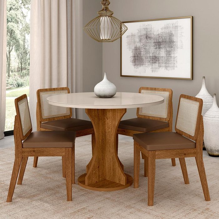 A Mesa Redonda Cali com 4 Cadeiras Sydney Sextavadas, trás Elegância e Conforto para sua Sala de Jantar as cadeiras são confortáveis para longas conversas e bons momentos em família.