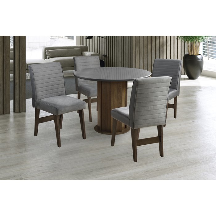 A Mesa Redonda com 4 Cadeiras Sala De Jantar Castanho/Cinza Dobuê Turim 78x103 é o presente da Dobuê Movelaria para você que sempre imaginou sua sala com requinte e design diferenciado. Com uma mesa 103 cm diâmetro é uma solução criativa e cheia de estilo, uma forma elegante para você arrumar a sua sala de jantar, sem contar as cadeiras, que levam ainda mais charme e beleza à sua casa. Conta com Pintura UV, que além de ser mais durável do que as pinturas convencionais, garante maior qualidade ao produto. Além disso, conta com acabamento em textura BP, muito mais uniforme, resistente e de visual imbatível.
