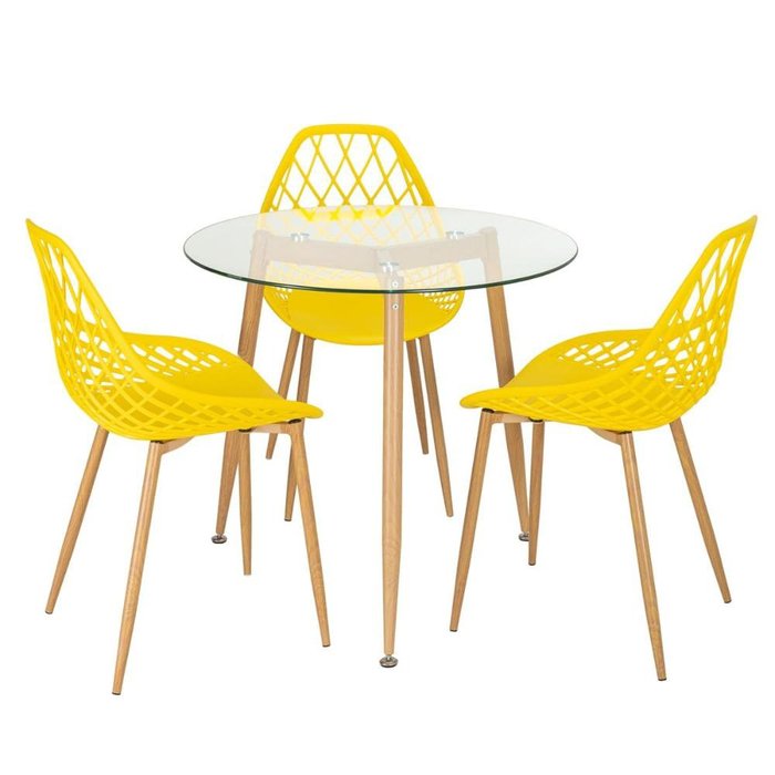 Mesa redonda com tampo de vidro 80 cm + 3 cadeiras Clarice Cloe Amarelo
