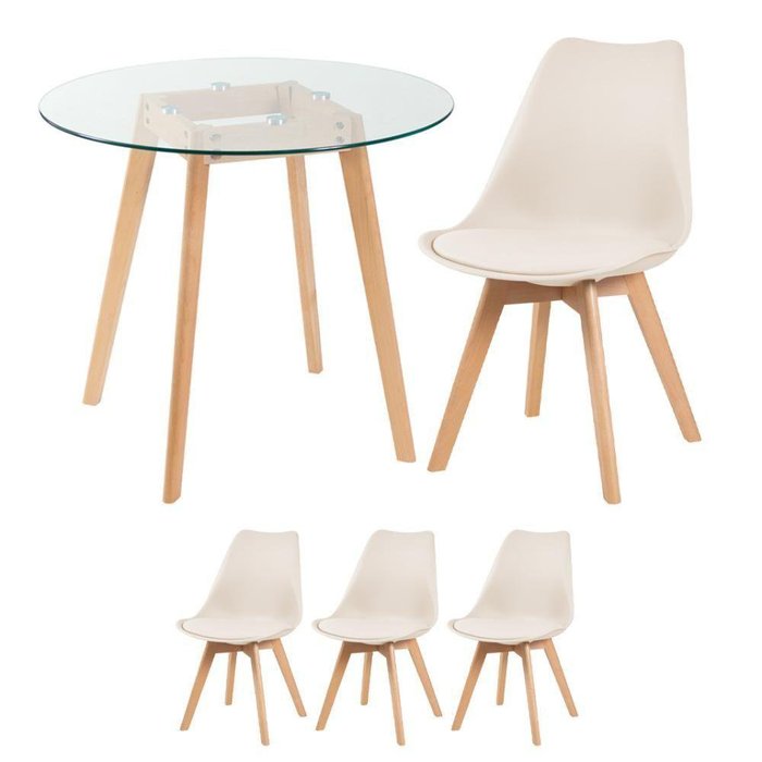 Mesa Redonda com Tampo de Vidro 80 Cm 3 Cadeiras Creme Bege