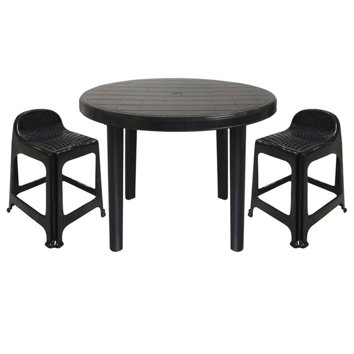 Mesa Redonda Desmontável de Plástico 94cm Preta + 2 Banquetas com Encosto