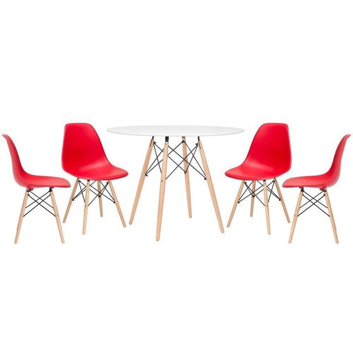 Mesa Redonda Eames 100cm Branco + 4 Cadeiras Vermelho Branco