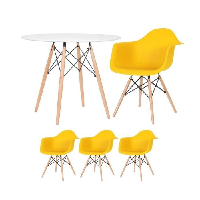 Cadeira modelo Eames DAW: Material do assento: Polipropileno - Material da base: Madeira e aço - Altura do encosto: 78cm - Altura do assento: 44cm - Altura do apoio de braços: 65cm - Largura do assento: 40cm - Profundidade do assento: 45cm - Distância entre os pés: 45cm - Peso suportado: 130kg. Mesa redonda Eames: Material do tampo: MDF laqueado - Material da base: Madeira natural e aço - Diâmetro do tampo: 90cm - Altura: 75cm - Garantia: 3 meses.