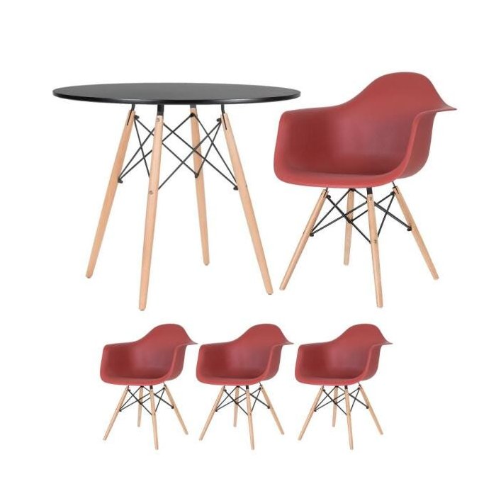 Cadeira modelo Eames DAW: Material do assento: Polipropileno - Material da base: Madeira e aço - Altura do encosto: 78cm - Altura do assento: 44cm - Altura do apoio de braços: 65cm - Largura do assento: 40cm - Profundidade do assento: 45cm - Distância entre os pés: 45cm - Peso suportado: 130kg. Mesa redonda Eames: Material do tampo: MDF laqueado - Material da base: Madeira natural e aço - Diâmetro do tampo: 90cm - Altura: 75cm - Garantia: 3 meses.