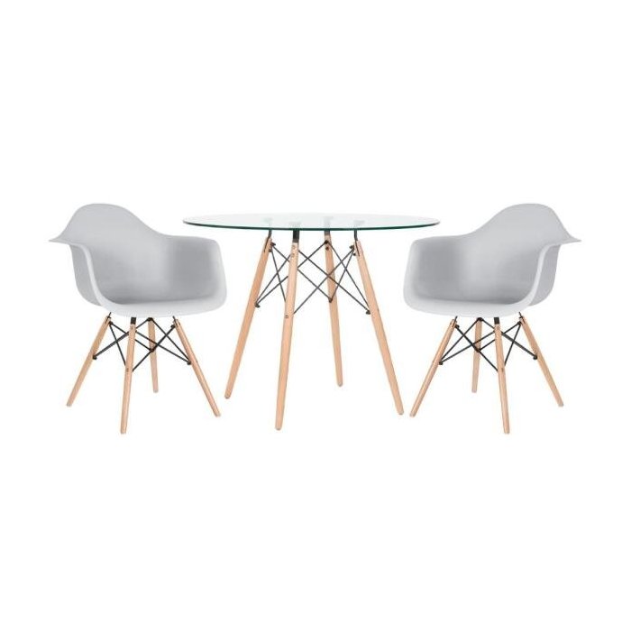 Mesa Redonda Eames com Tampo de Vidro 100cm + 2 Cadeiras Eiffel Daw Cinza Claro