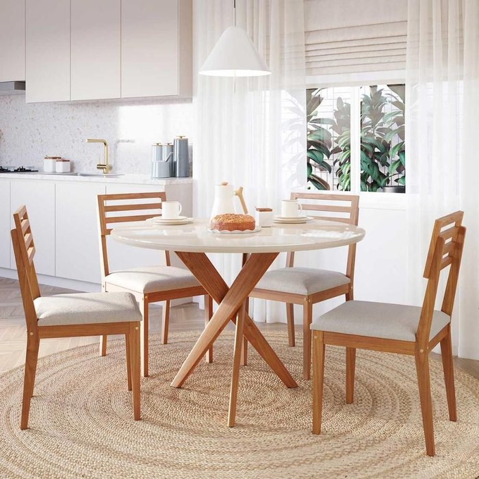 Conjunto Sala de Jantar Cacau Redonda 1,09 com Vidro e 4 Cadeiras Juparanã Madeira/Off White/Linho CinzaA Mesa Cacau Redonda une elegância e funcionalidade em um design que valoriza qualquer ambiente. Com diâmetro de 1,09 metro e tampo de vidro, oferece sofisticação e praticidade na hora da limpeza. Fabricada em Madeira Maciça de Eucalipto de alta qualidade, garante estabilidade e resistência. Acompanha 4 cadeiras Juparanã, que proporcionam conforto e requinte, ideais para transformar suas refeições em momentos ainda mais especiais.Atenção! Antes de efetuar a compra, leia atentamente todas as informações sobre o produto para garantir que ele atende às suas necessidades e expectativas. Verifique as dimensões e certifique-se de que o item pode ser transportado sem dificuldades até o local desejado. É essencial conferir se as medidas são compatíveis com elevadores, portas e corredores do prédio, pois não realizamos montagem ou desmontagem do produto, remoção de portas e janelas, transporte por escadas ou içamento pelo lado externo do edifício. Para entregas em condomínios, caso a portaria permita, a mercadoria será deixada no térreo, ficando sob responsabilidade do cliente transportá-la até seu apartamento ou casa. A transportadora não está autorizada a entrar no domicílio, fazer entregas por meios alternativos, como içamento pela janela, subir escadas, instalar ou realizar manutenção do produto, abrir embalagens, coletar devoluções, entregar em endereço diferente do informado na Nota Fiscal (DANFE) ou realizar a entrega a menores de idade ou pessoas sem identificação. Certifique-se de que todas as condições de entrega estão adequadas antes de finalizar a compra, evitando transtornos no recebimento do seu pedido. Em caso de dúvidas, entre em contato conosco.Ficha técnica do Produto