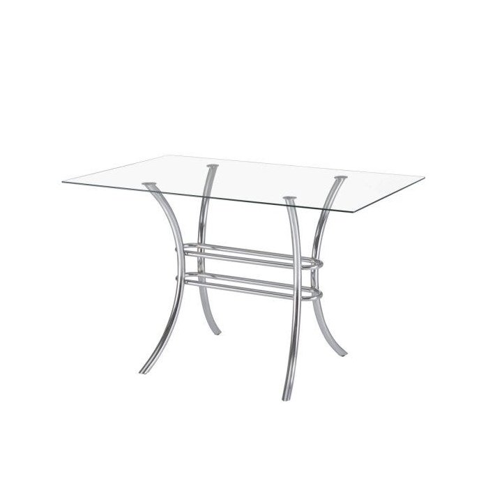 Mesa Cromada Priscila Ref. 2600/M com tampo de vidro incolor, não temperado, medindo 120cmx80cm, base da mesa em tubo de aço carbono com acabamento cromado, ideal para utilizar em cozinhas ou salas de jantar.