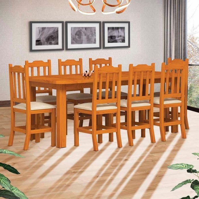 Descrição Geral dos Produtos Construção Durável: Fabricado em robusta madeira maciça de eucalipto, garantindo resistência e longa durabilidade. Estilo Elegante: Acabamento semi brilho proporciona um toque de sofisticação ao ambiente. Descrição Diferencial da Mesa Pés Inclusos: Simples e prático, este produto acompanha os pés necessários, garantindo estabilidade e durabilidade ao seu móvel. Capacidade Robusta: Projetado para suportar até 100KG, combinando estilo e funcionalidade. Descrição Diferencial da Cadeira Cadeira Aconchegante com Estofado Incluso: Ideal para momentos de refeição ou descontração, esta cadeira de design elegante acompanha um estofado incluso, garantindo conforto e estilo à sua casa. Capacidade Robusta: Projetado para suportar até 120KG, combinando estilo e funcionalidade. Dimensões da Mesa: Largura 88 cm; Profundidade 200 cm; Altura 80 cm. Dimensões da Cadeira: Largura 38 cm; Profundidade 41 cm; Altura 100 cm. Itens Inclusos: 1 Mesa e 8 Cadeiras Complexidade da montagem: Média, pode ser montado por apenas uma pessoa e/ou necessite de maior conhecimento para montagem. Recomendações de uso, manutenção e limpeza: Limpar com flanela ou pano macio seco, não utilizar produtos abrasivos, desengordurantes, álcool ou solvente. Não expor o produto diretamente a luz solar e à umidade Garantia: 3 meses OBS: Foto meramente ilustrativa, objetos, utensílios e decoração não fazem parte do produto. Tonalidade: Marrom | Cor: Marrom Off White | Largura: 88 | Altura: 80 | Altura Montado: 80 | Largura Montado: 88 | Peso Montado: 63 | Profundidade Montado: 200 | Comprimento: 80 | Peso: 63 | Material: Madeira Maciça | Estado de Origem: São Paulo