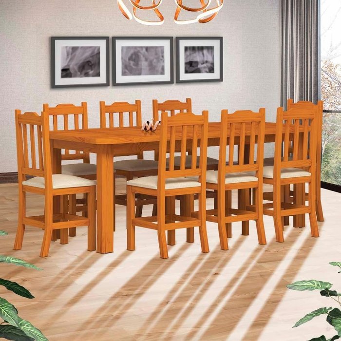Descrição Geral dos ProdutosConstrução Durável: Fabricado em robusta madeira maciça de eucalipto, garantindo resistência e longa durabilidade. Estilo Elegante: Acabamento semi brilho proporciona um toque de sofisticação ao ambiente. Descrição Diferencial da MesaPés Inclusos: Simples e prático, este produto acompanha os pés necessários, garantindo estabilidade e durabilidade ao seu móvel.Capacidade Robusta: Projetado para suportar até 100KG, combinando estilo e funcionalidade.Descrição Diferencial da CadeiraCadeira Aconchegante com Estofado Incluso: Ideal para momentos de refeição ou descontração, esta cadeira de design elegante acompanha um estofado incluso, garantindo conforto e estilo à sua casa.Capacidade Robusta: Projetado para suportar até 120KG, combinando estilo e funcionalidade.Dimensões da Mesa: Largura 88 cm; Profundidade 200 cm; Altura 80 cm.Dimensões da Cadeira: Largura 38 cm; Profundidade 41 cm; Altura 100 cm.Itens Inclusos: 1 Mesa e 8 CadeirasComplexidade da montagem: Média, pode ser montado por apenas uma pessoa e/ou necessite de maior conhecimento para montagem.Recomendações de uso, manutenção e limpeza: Limpar com flanela ou pano macio seco, não utilizar produtos abrasivos, desengordurantes, álcool ou solvente. Não expor o produto diretamente a luz solar e à umidadeGarantia: 3 mesesOBS: Foto meramente ilustrativa, objetos, utensílios e decoração não fazem parte do produto.