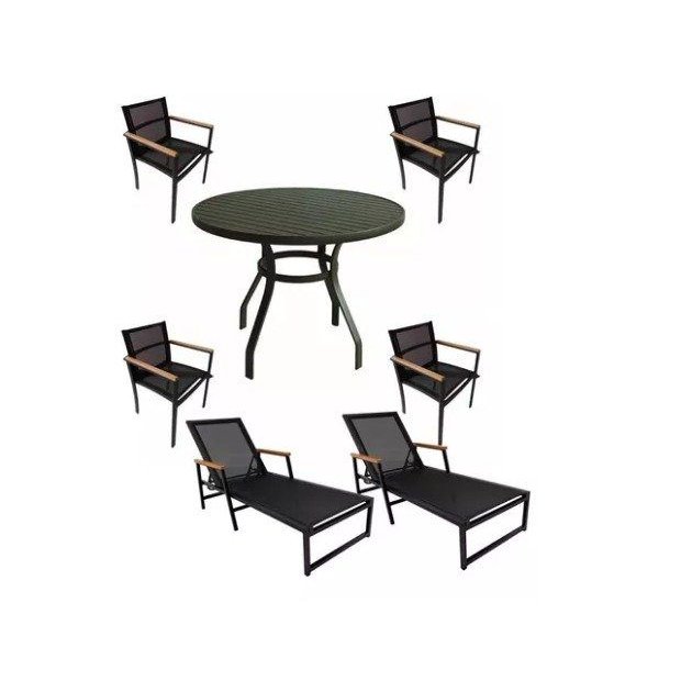 Transforme seu espaço ao ar livre em um oásis de conforto e estilo com este conjunto de móveis de jardim. A mesa ripada, com um generoso diâmetro de 90cm, é perfeita para acomodar refeições e momentos de convívio ao ar livre. Com quatro cadeiras em alumínio resistente e duas espreguiçadeiras ajustáveis, este conjunto oferece o equilíbrio perfeito entre durabilidade e elegância.