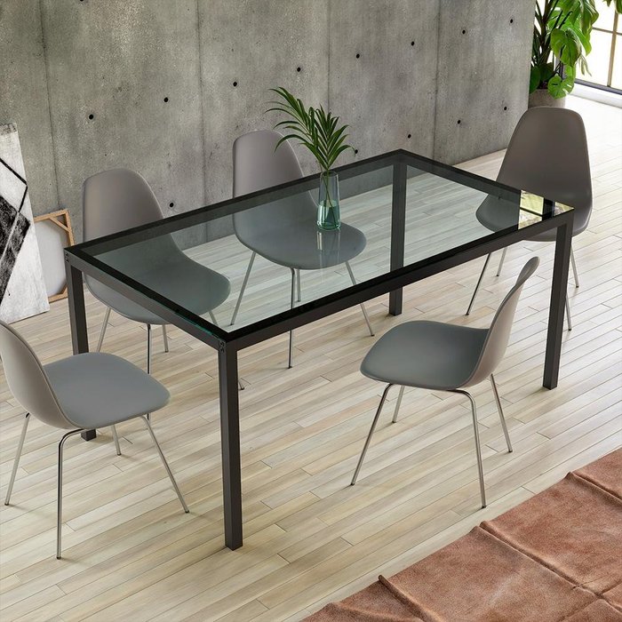 Mesa Sala de Jantar Cozinha Tampo de Vidro Retangular Soul 136 cm 6 Lugares 4 Pés em Aço Preto Preto