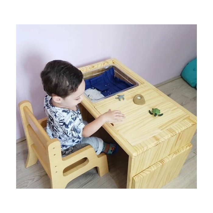 A bandeja ou a mesa de experimentação devem estar acessíveis à criança. Isso despertará sua curiosidade, de tal forma que a aprendizagem surge de seu próprio interesse.