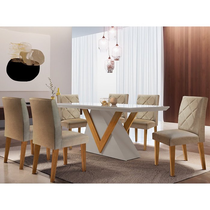 Quando a matéria é sofisticação e inovação, apresentamos o Conjunto de Mesa Zaira com Cadeira Olimpia! Um conjunto completo, com tudo o que você precisa para arrasar quando for receber amigos e familiares: 6 cadeiras confortáveis, com detalhes bordados no tecido, na parte frontal do encosto; tampo muito bem dimensionado, vidro temperado com pintura especial e um design inovador e chamativo. Além do visual moderno, a combinação de cores também resulta em um móvel elogiável em qualquer situação.