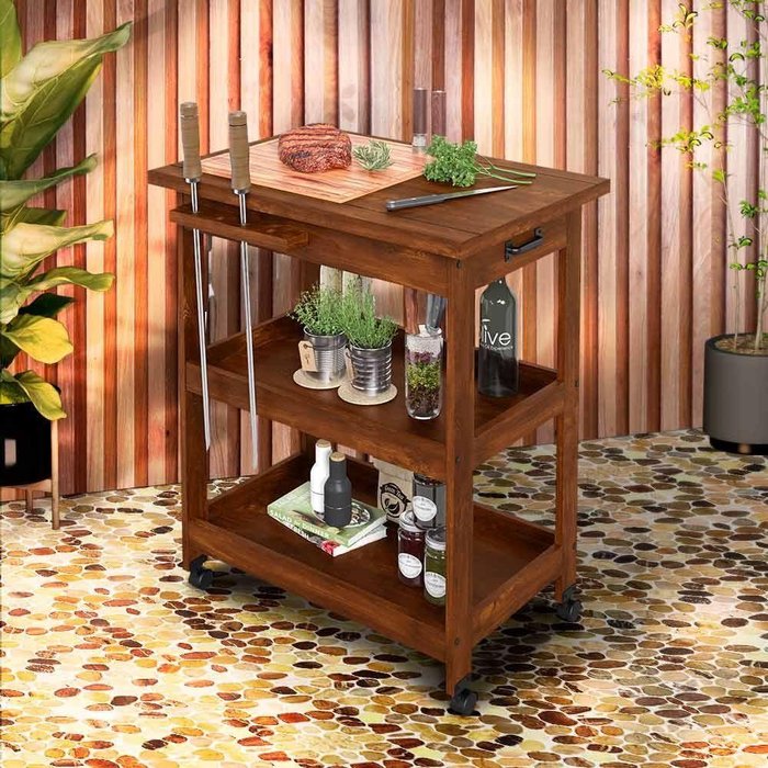 Mesinha Churrasco com Tábua Corte e Rodinhas Imbuia Firepit Shop Jm Única