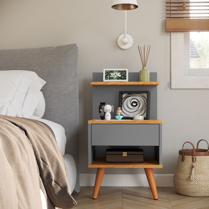 Mesinha de Cabeceira para Quarto com Nicho e Gaveta Cinza Preto