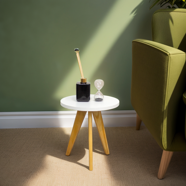 Nossa mesinha apresenta um design escandinavo com linhas simples e elegantes, destacando-se pelo tampo redondo na cor branca que oferece um visual limpo e neutro, fácil de harmonizar com diferentes estilos de decoração. Seus pés de madeira clara, inclinados e afilados, adicionam um toque rústico e moderno, equilibrando funcionalidade e estilo.