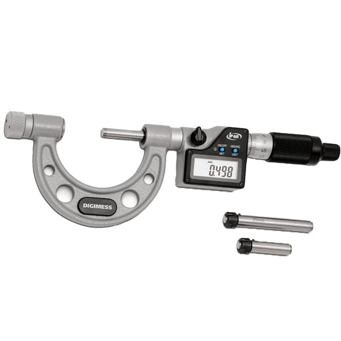 Micrômetro Externo Digitais Com Batentes Intercambiáveis - Cap. 50-100 mm - Graduação De 0,01mm - Ref. 110.231-NEW(IP65) - DIGIMESS O Micrômetro é um instrumento de leitura direta das dimensões reais do objeto, com precisão da ordem de milésimos. Ele é utilizado, principalmente, para medições de precisão superior a do paquímetro e para medidas de profundidade. ESPECIFICAÇÕES:- Arco fabricado em ferro fundido nodular, maciço, pintado e esmaltado (para capacidades de 0-300mm)