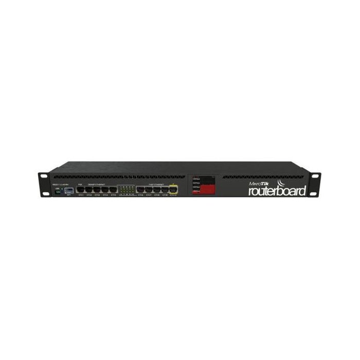 Possui case metálico padrão rackmount, 5 Ethernet, 5 Gigabit Ethernet, encaixe SFP, saída PoE na porta 10, CPU 600MHz, 128MB RAM e RouterOS L5.