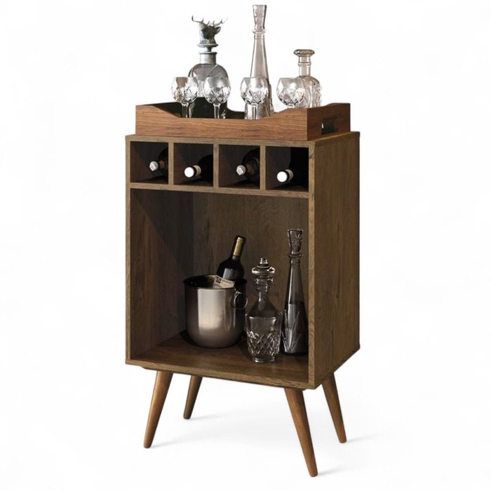 Design sofisticado na cor nogal com madeira natural Estrutura em MDP 12mm e pés em madeira maciça Bandeja solta prática e funcional Adega para até 4 garrafas Ideal para salas, varandas, halls e áreas gourmet Móvel compacto, moderno e decorativo