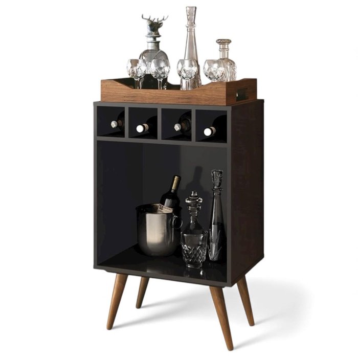 Design moderno e elegante em preto com madeira natural Estrutura em MDP 12mm e pés em madeira maciça Bandeja solta prática e multifuncional Adega com espaço para até 4 garrafas Ideal para salas, varandas, halls e espaços gourmet Compacta, durável e de fácil combinação com diferentes estilos