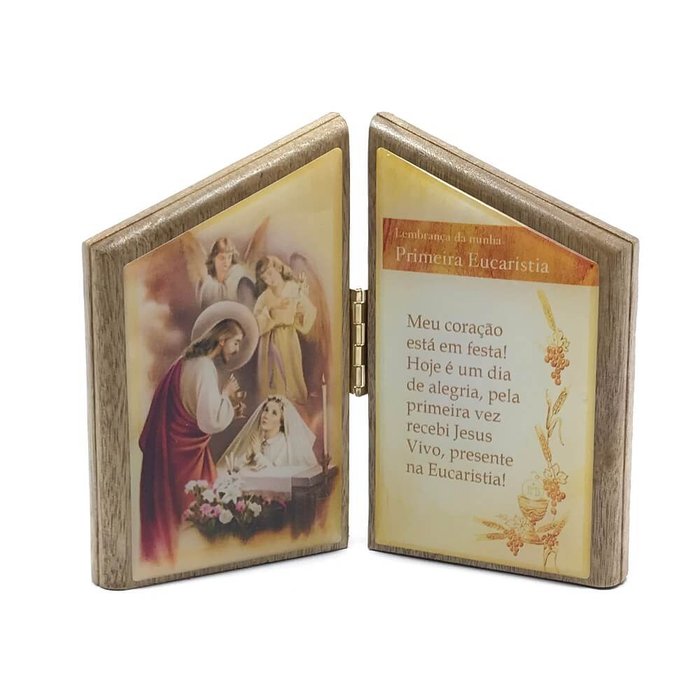 Mini Adorno Oração de Mesa Eucaristia Comunhão Menina Desenvolvido em material de excelente qualidade que garante mais resistência e durabilidade, a Oração de Mesa Eucaristia Comunhão Menina é perfeito para quem deseja ter mais um elemento religioso no oratório, capela, santuário ou capelinha. Ideal para decoração de mesas de diversos ambientes, além de ser uma ótima lembrança religiosa. Madeira | Resina Acabamento: Corte a laser, foto resinada. Imagem: Mãe Rainha e oração. Dimensões Aberto: 10 cm (altura) x 12 cm (comprimento) x 1 cm (espessura) Dimensões Fechado: 10 cm (altura) x 6 cm (comprimento) x 3 cm (espessura)