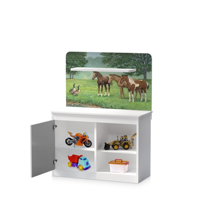 DESCRIÇÃONÃO acompanha os brinquedos, a imagem é meramentePossui opicional de 2 prateleiras ilustrativaProduto 100% MDFAcompanha adesivo