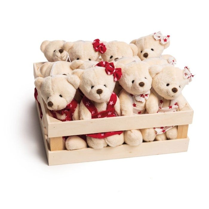 Mini box com 12 mini ursos e ursas com roupa vermelha e estrelas, e com roupa rosa e estrelas