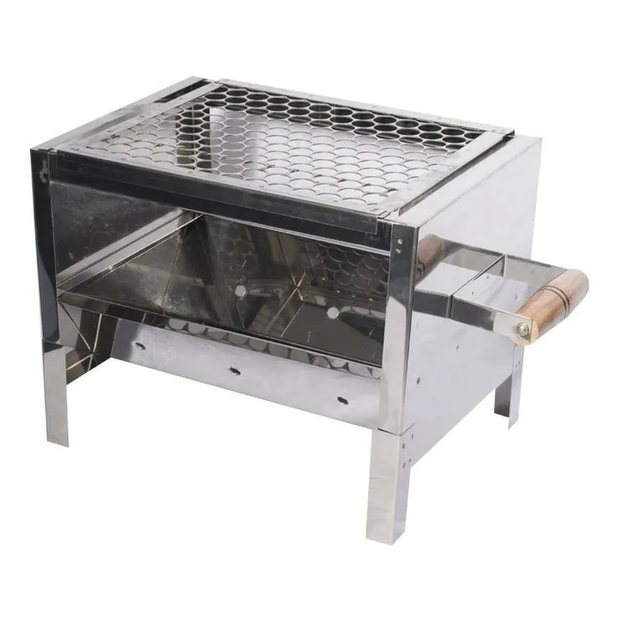 A Mini Churrasqueira acompanha grelha, cabe na pia ou mesa, e é super fácil de limpar pois é feita de Aço Inox 430. Tem apoio de madeira para evitar queimaduras na hora de movê-la.