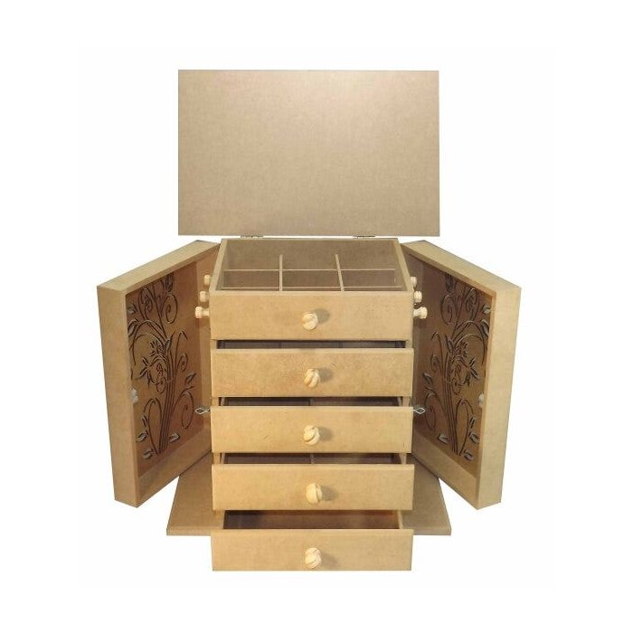 Produzida em MDF, com 5 gavetas, 2 gavetas com 9 divisões, 1 com 6 divisões, 1 com 4 divisões e 1 gaveta sem divisão, tampa superior que levanta, e 2 portas laterais que podem ser abertas, possuem 3 pitões de cada lado para colocar colares. Acompanha 5 Puxadores em MDF. Ideal para guardar produtos de maquiagem, esmalte, bijuterias e joias.