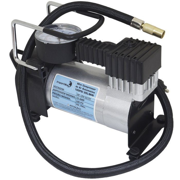 Mini Compressor de Ar Automotivo Portátil 12V 100 Psi com 3 Adaptadores Importway IWMCA-10020