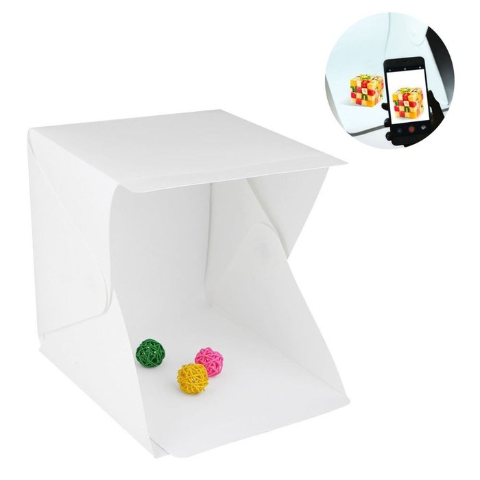 O Mini Estúdio portátil irá lhe proporcionar uma excelente iluminação para fazer Fotografia Still, ou seja, Fotografia de Produtos e Pequenos Objetos. Sua iluminação de LED 6000k Branco Frio embutido é ideal para Fotografia de Produtos, pois não altera a cor do objeto fotografado.Possui 1 barra com 30 LEDs na parte frontal do Estúdio, que evita a existência de sombra nas fotos, deixando a imagem perfeita. Ele conta também com uma abertura superior com tampa e velcro para inclusão de mais iluminação ou para ângulos fotográficos vindo de cima.Permite uma montagem e instalação rápida e prática que quando desmontado fica em formato reduzido. Suas medidas montado são de 30 cm de largura, 31 cm de profundidade e 34cm de altura e quando desmontado em formato de fechado ele mede 30 x 30cm.Produzido com resistentes paredes plásticas de polipropileno, pesa apenas 500 gramas. ATENÇÃO: PRODUTO ACOMPANHA CABO USB (VERIFICAR COMPATIBILIDADE COM SEUS DISPOSITIVOS).ATENÇÃO: PRODUTO NÃO ACOMPANHA ADAPTADOR PARA TOMADAS. Especificações:Estrutura firme fabricado com material de primeira qualidade.Luz LED | Daylight 6000K, brancaCores do Fundo: Branco e PretoCor Estúdio: BrancoCompatibilidade com Celulares e CâmerasMaterial: Polipropileno e Aço (Botões)Design dobrável, Fácil para você guardar acompanha dois cenários, branco e preto em borracha EVA para melhor atender às suas necessidadesIdeal para produtos de pequena dimensão.Use o cabo micro USB, Celulares, Notebook's, Power bank's (baterias externas) ou o seu carregador como fonte de alimentação.