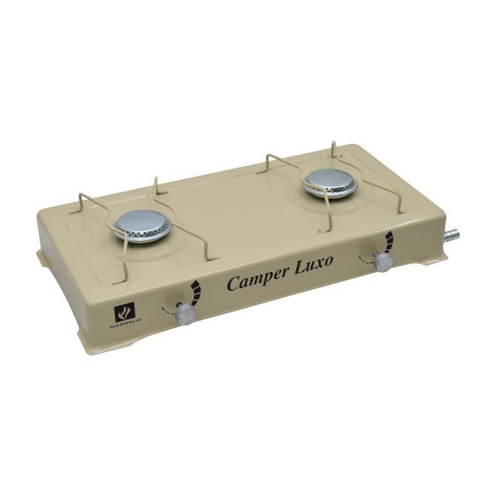 Fogão portátil para camping com 2 bocas e regulador individual de altura de chamas.