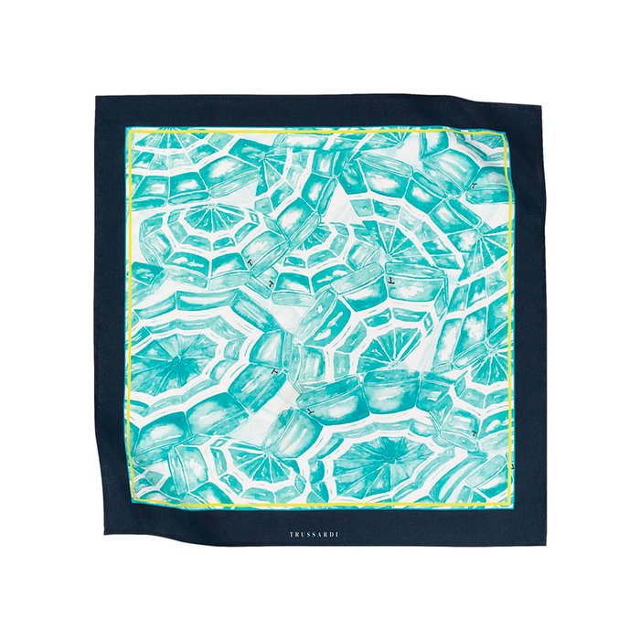 O Mini Lenço La Fontelina é elegante e esbanja beleza com seus ricos detalhes desenhados à mão na cor azul esmeralda acompanhado de uma sutil moldura amarela, revela todo o requinte e vida artística que faz lembrar os guarda-sóis listrados que é um ícone desse local paradisíaco.