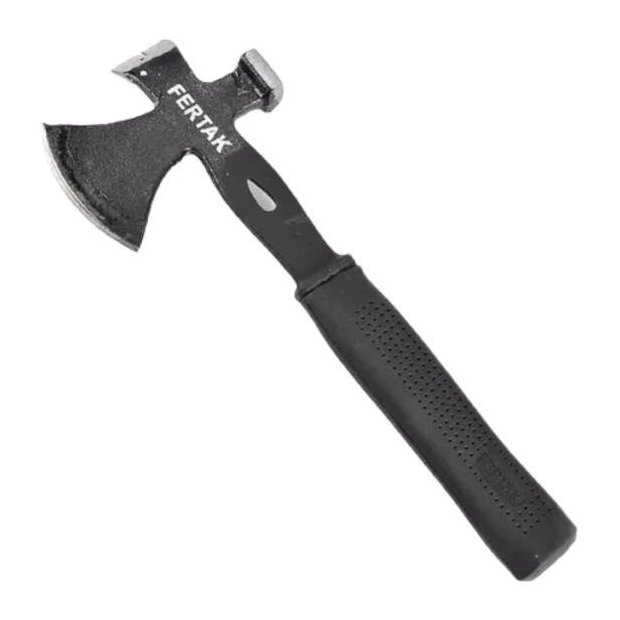 Mini machado em aço Marca Fertak Construído em aço forjado Possui cabo emborrachado Ideal para aventuras , camping, pesca, caçada, entre outros esportes Possui algumas funções como: - Martelo - Pé de cabra - Extrator de prego ou parafuso - Corte Dimensões: 35 cm x 12 cm Peso: 900 gramas Comprimento da lâmina de 10 cm Lâmina enviada sem corte, necessário afiar para uso Garantia de 3 meses para defeitos de fabricação