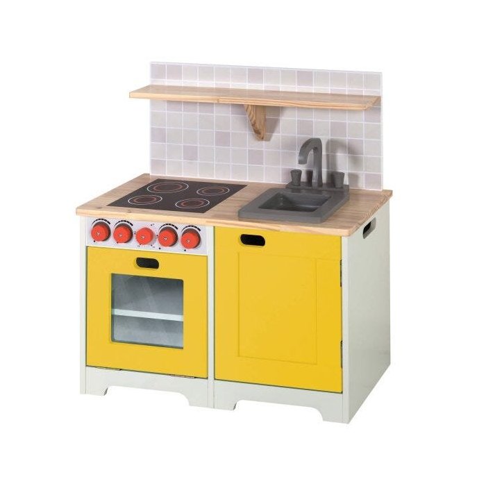 Estrutura principal em MDF com pintura laca acetinada. Tampo, botões do fogão, prateleira externa são em madeira maciça (pinus). Tampo e prateleira externa possuem acabamento em verniz, destacando o desenho natural da madeira. Detalhes como o painel e o fogão são em adesivo, e a porta do forno em acrílico, para que as crianças possam observar suas comidinhas ficando prontas! A cozinha está disponível em 3 cores diferentes, podendo ser combinada com a geladeira, deixando a brincadeira ainda mais completa! O mini móvel é entregue desmontado e acompanha manual de instrução e ferragens.