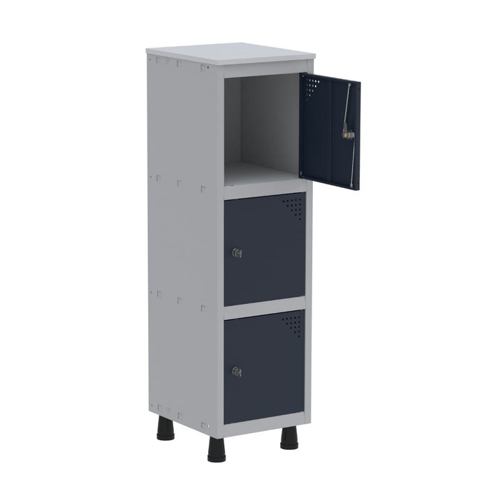 O mini roupeiro de aço com 3 portas, ideal para organizar escritórios e outros ambientes da casa, combina praticidade e funcionalidade. Totalmente montável sem necessidade de parafusos, ele possui fechamento por pitão para cadeado (cadeados não inclusos) e é feito de chapas de aço #26 com 0,45 mm de espessura, garantindo durabilidade. Os pés removíveis em polipropileno preto completam sua estrutura robusta. Com pintura eletrostática a pó no gabinete e esmalte sintético nas portas coloridas, oferece um visual moderno e atraente. Suas dimensões são 122 cm de altura, 34,5 cm de largura e 40 cm de profundidade.