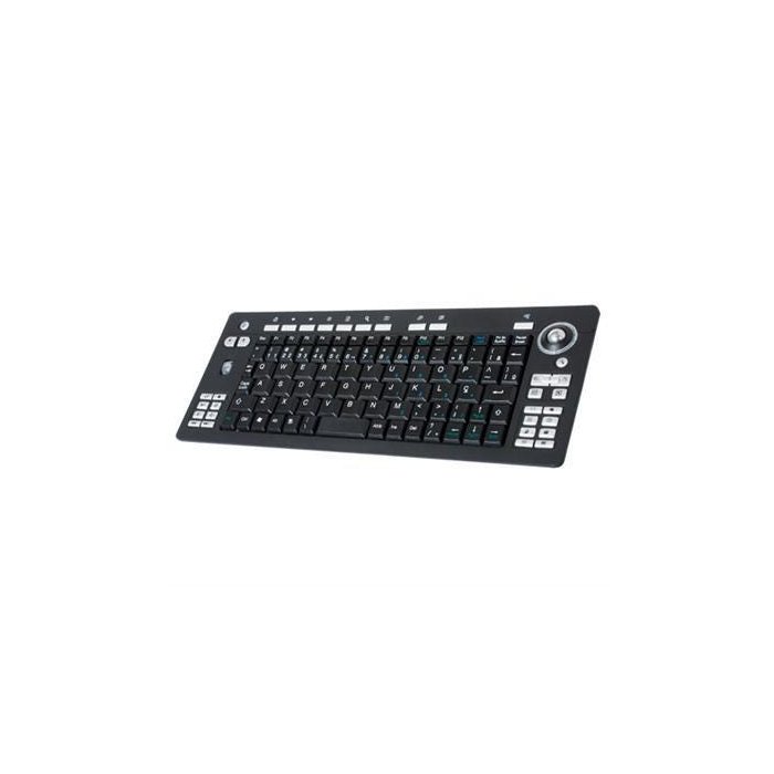 - Mouse Trakball integrado com sensor óptico de 800 CPI, botões esquerdo/direito e scroll