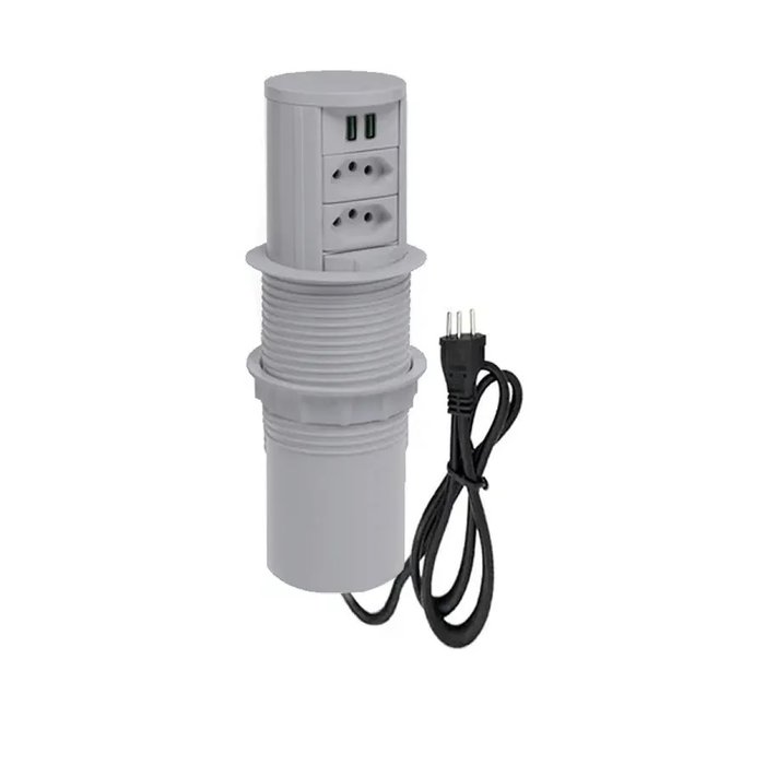 Mini Totem Mesa Manual 2nbr20a + 2USB Qm12056 QTMOVO Mini Totem POP é um produto compacto e compatível com ambientes residenciais, como na utilização em armários aéreo, cozinhas, salas e quartos.ConfiguraçõesVocê encontra a torre de tomada POP somente com tomada NBR 14136. São duas e a entrada é tanto em 127V como 220V.Já o modelo que tem USB, ele vem com 2 tomada NBR 14136 e dois USBs. A Saída USB 5V DC – 3A. A corrente máxima utilizando 1 saída é de 3A. Ao utilizar duas ao mesmo tempo, a corrente total se divide conforme demanda de cada aparelho.Como funciona a nossa Torre de Tomada POPA abertura é manual Push Pull, ou seja:Para abrir o totem POP:- Pressione no centro. O totem subirá parcialmente.- Puxe-o até que a trava seja acionada.Para recolher o totem:- Desconecte os plugs em uso.- Empurre a trava para dentro e pressione o totem até que tranque.Passo a passo da instalação:- Faça o furo no móvel, utilizando serra copo de 70mm- Remova o anel de travamento.- Passe o cabo pela furação e coloque o Mini Totem. Certifique-se que está bem encaixado.- Embaixo do móvel: Passe o anel de travamento pelo cabo de alimentação. Rosqueie até que trave. - Aperte firmemente o anel até pressioná-lo contra a parte inferior do móvel.- O Mini Totem está Instalado. Basta ligar na tomada lembrando de respeitar as informações de alimentação elétrica.Garantia e Entrega - Produto com Nota Fiscal - Garantimos a entrega ou seu dinheiro de volta