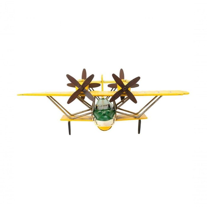 Avião Amarelo De HéliceEnfeite decorativo em forma de um avião amarelo de dupla hélice com 12 x 28 x 35,5 cm de dimensão, detalhes e cores muito realista. Material: metal; Atenção: este produto tem apenas função decorativa, não é um brinquedo e nem um avião de verdade! Informação AdicionalPeso (Kg): 0.50
