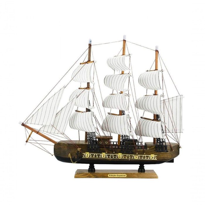 Miniatura Barco Navio Veleiro Madeira CanhõesEnfeite no formato de miniatura de barco navio veleiro com 42,5 cm de altura, 9 cm de largura e 49 cm de comnto. Modelo se destaca canhões dourados posicionados no casco. Vem com suporte para ficar em posição. Material: madeira; Função exclusivamente decorativa Informação AdicionalPeso (Kg): 0.84